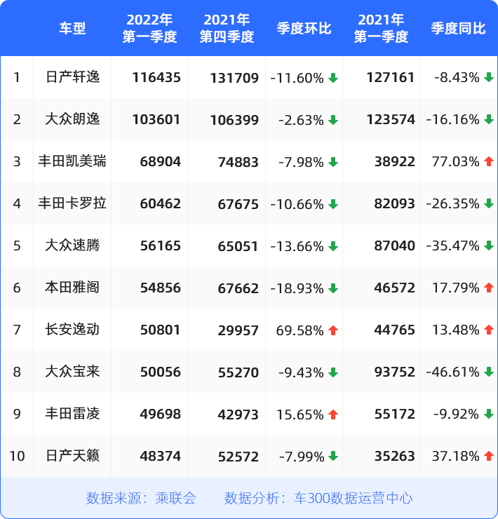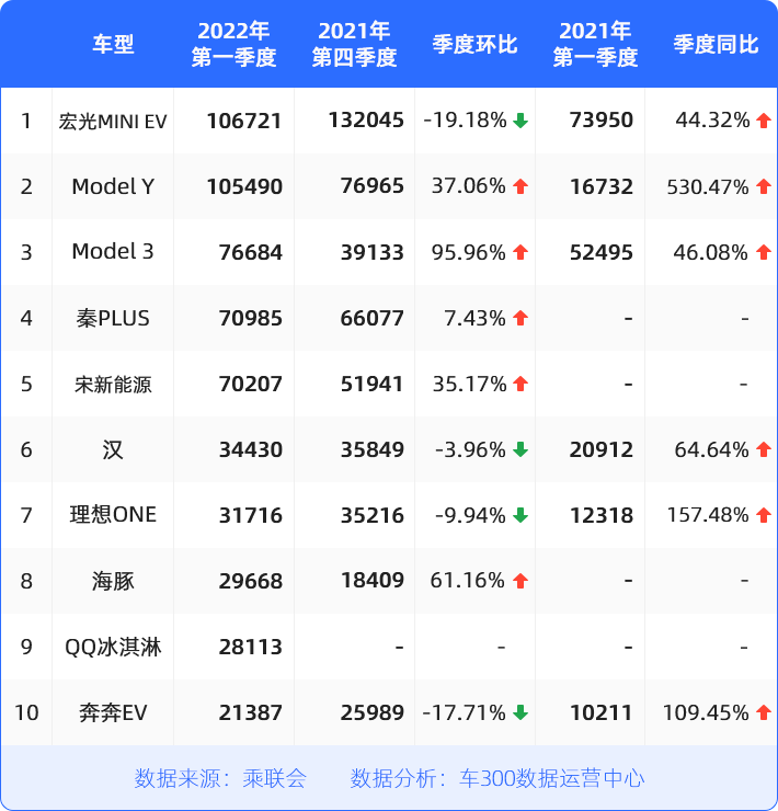 具体到车型上,“街头小霸王”五菱宏光MINI EV一季度销量超过10万,同比增长44%,再度夺魁,在轿车榜销量中,仅次于轩逸,位居第二;榜三至榜五车型销量均超7万辆,力压凯美瑞、卡罗拉等一众燃油热门车。