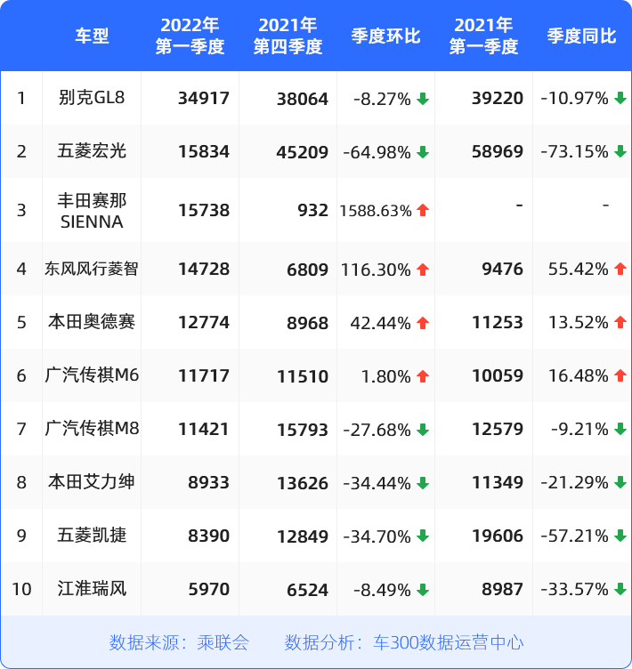 一季度,别克GL8销量破3万,登顶MPV销量榜;昔日王者五菱宏光,表现平平,已无往日风采;丰田赛那跃至榜单第三,销量基本与五菱神车持平。