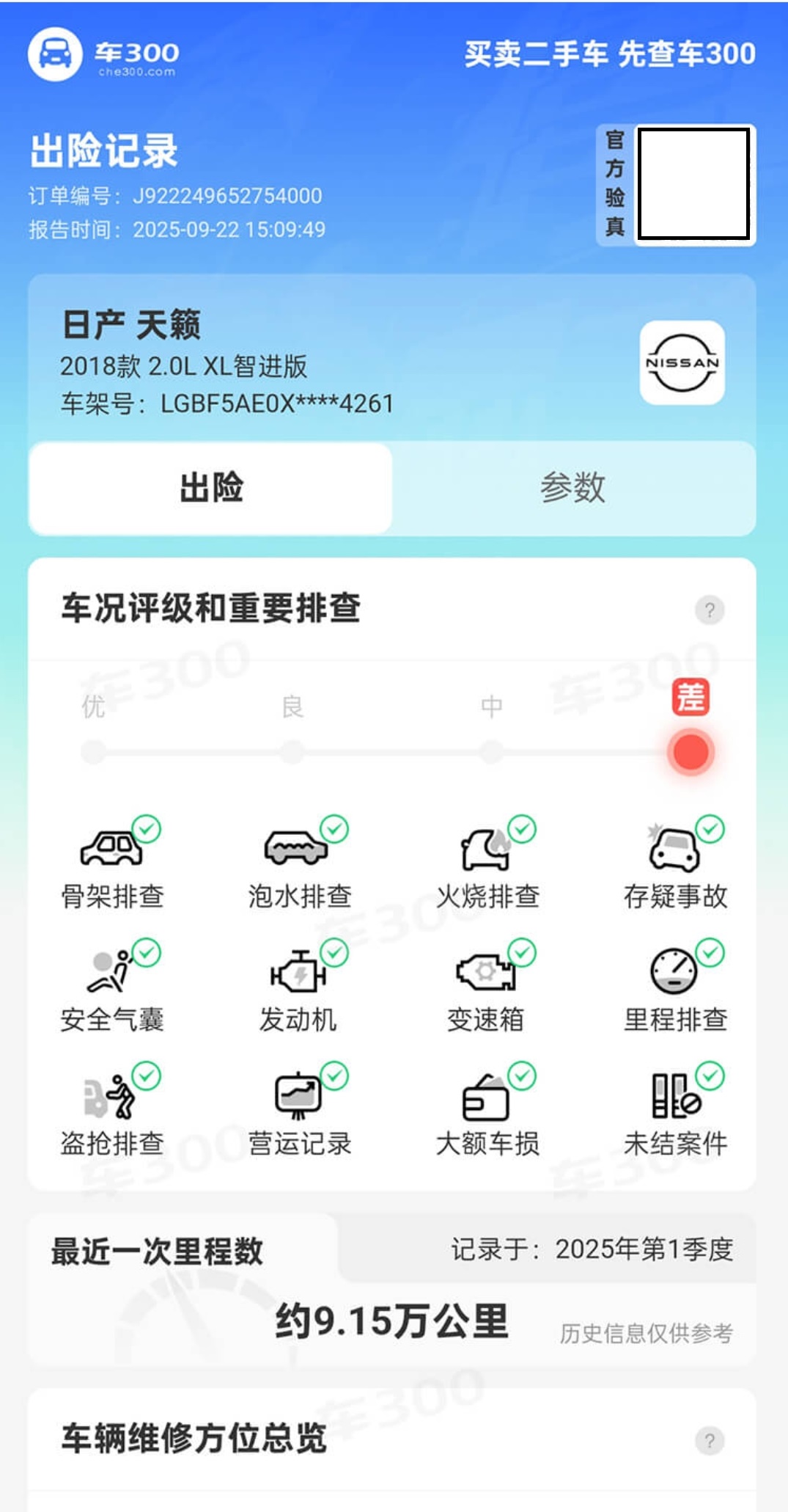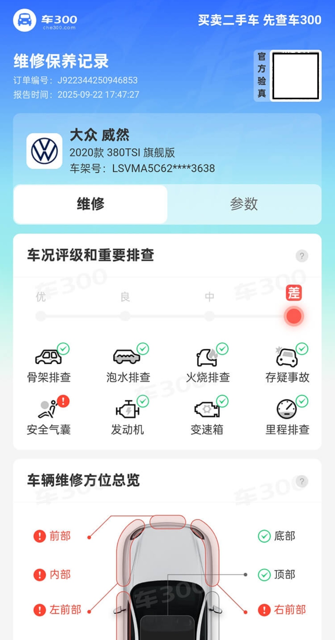 总结来说:出险记录看“事故伤”,维保记录看“内伤和假龄”。两份报告交叉验证,才能还原一辆车的真实车况。
