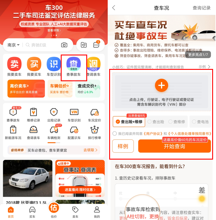 ● 查询方式:应用商店搜索并下载“车300二手车”APP或微信搜索小程序“车300二手车”,在首页找到“查事故车”或者“查调表车”功能,输入车架号(VIN码)即可快速获取车况概览报告,适合初步筛选。