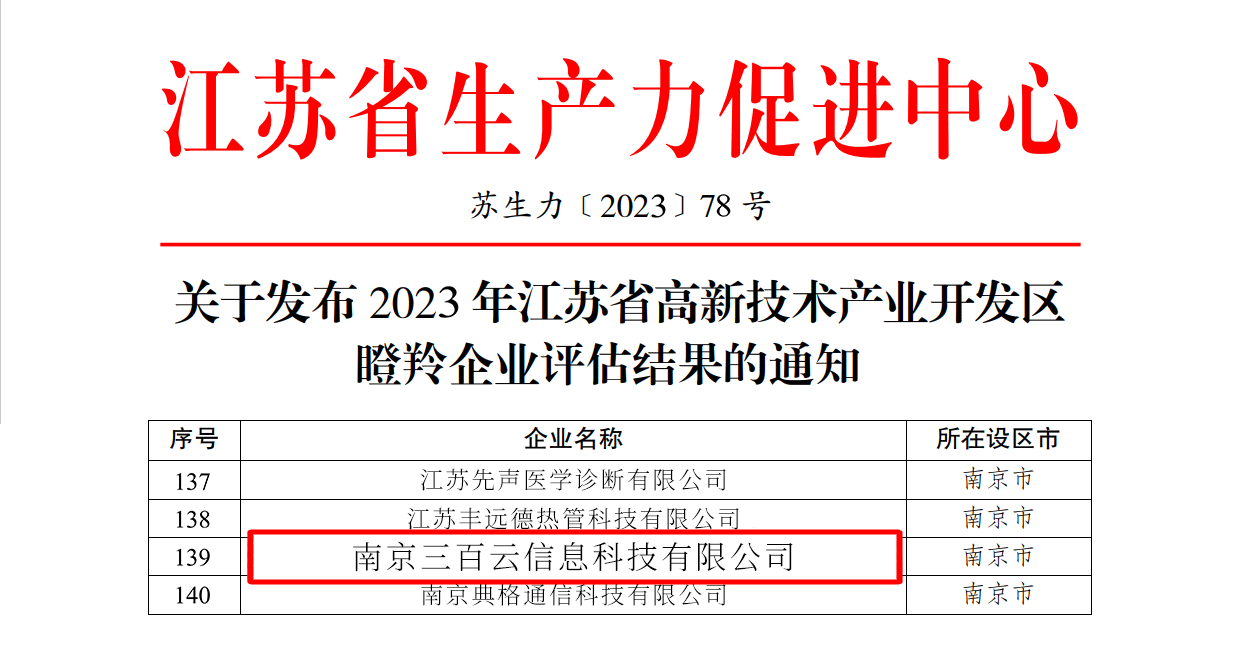 近日,江苏省生产力促进中心发布“2023年江苏独角兽企业暨高新区瞪羚企业评估结果”。南京三百云信息科技有限公司(下称三百云)再次脱颖而出,连续获评省级“瞪羚企业”殊荣,体现企业成长性获得市场长期认可。