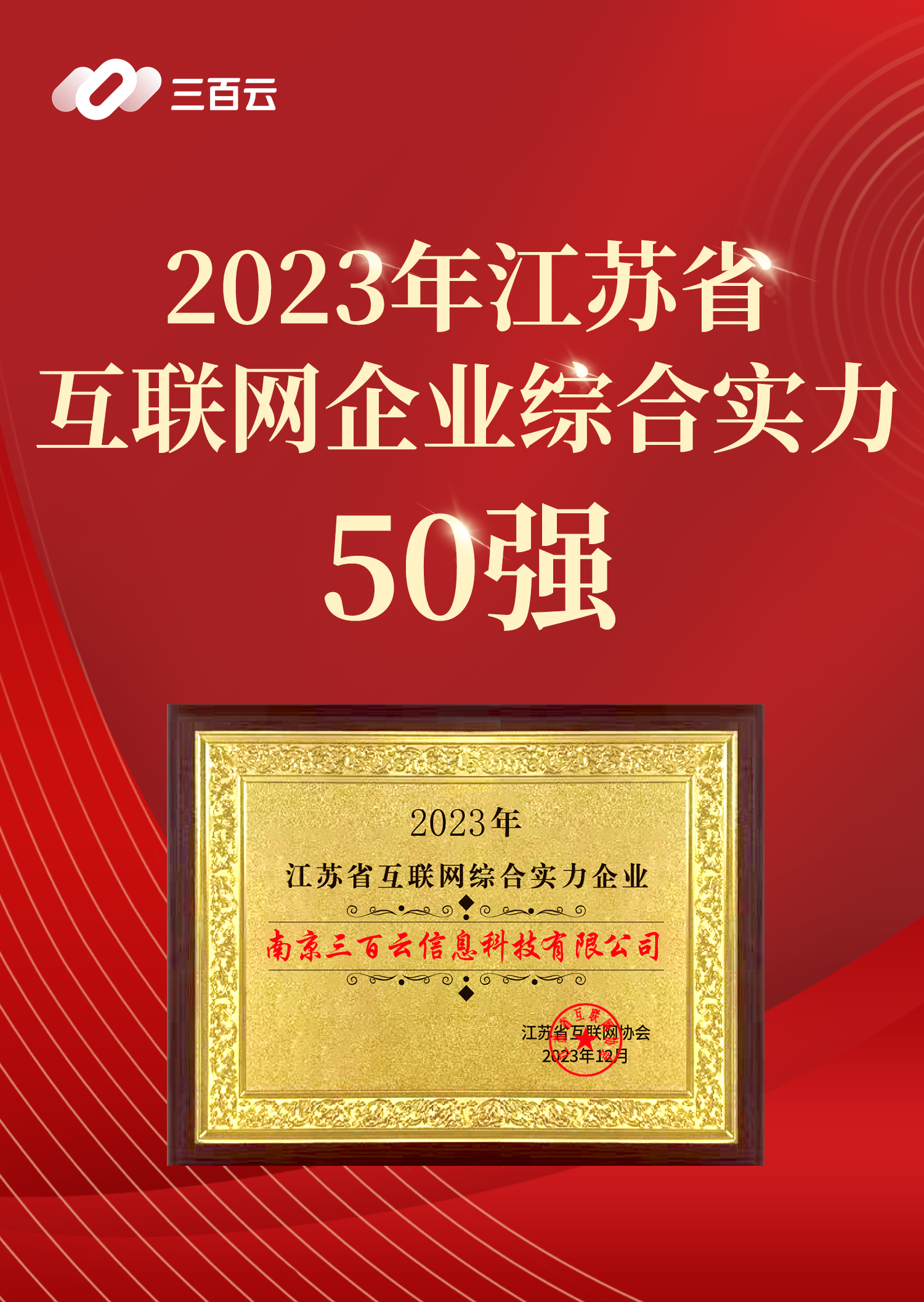 2月1日,江苏省互联网企业综合实力50强榜单揭晓,三百云并凭借在互联网方向的创新、科技助力金融业数字化转型等方面的突出表现入选。