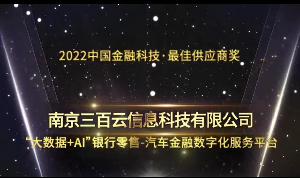 1月12日,“2023 中国金融科技创新与应用外滩高峰论坛暨第三届长三角金融科技创新与应用全球大赛总决赛”上,南京三百云信息科技有限公司(下称三百云)凭借“大数据+AI银行零售-汽车金融数字化服务平台”项目脱颖而出,荣获“2022中国金融科技·最佳供应商奖”。