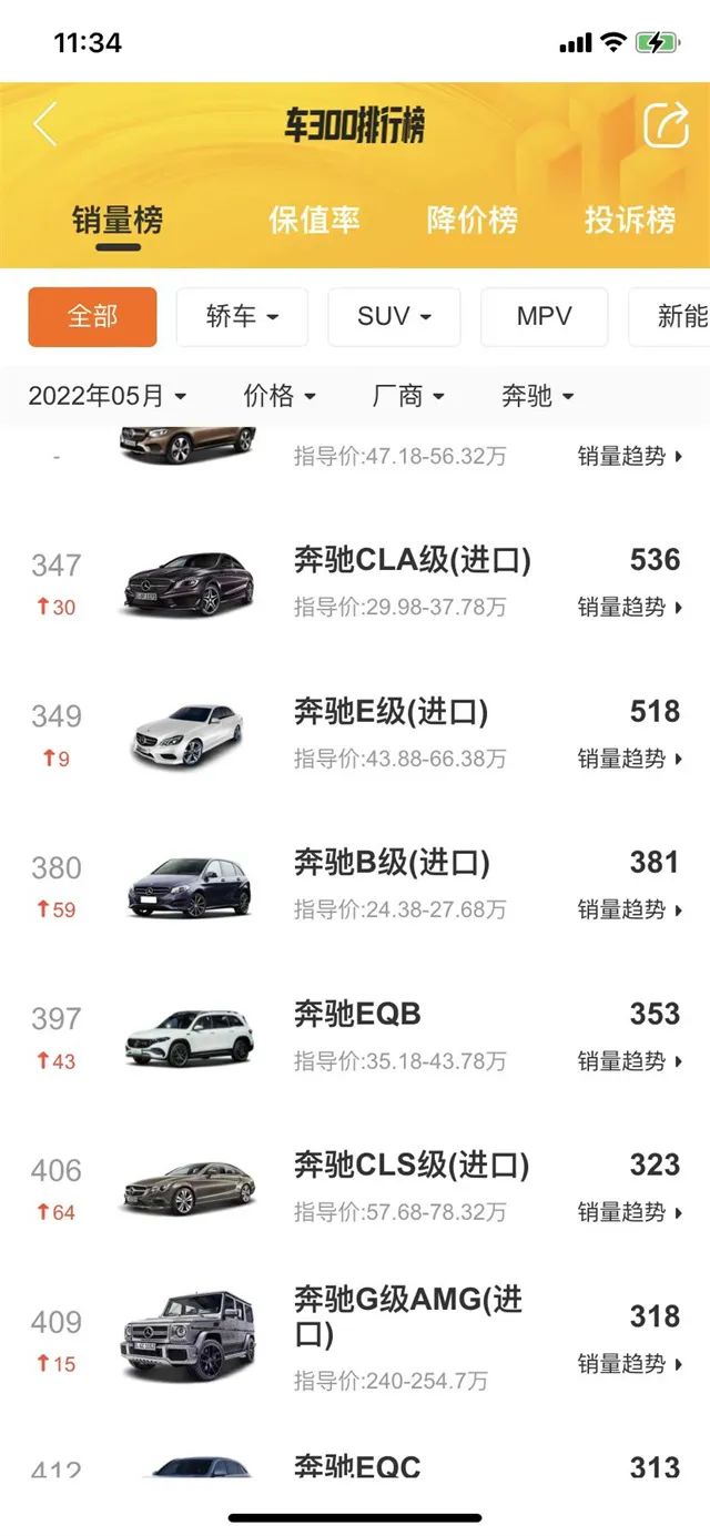 小三爷查看了车 300 二手车 APP 的销量排行榜,奔驰 A 级的 5 月销量达到了 2099 辆,入门版本在某些地区的落地价已经到了 20 万以内,绝对数据上肯定不如目前奔驰主销车型奔驰 C 级、GLC 以及奔驰 E 级,但根据定位来说市场表现也还可以,并且销量比 GLA、CLA、EQB、EQA 都高。