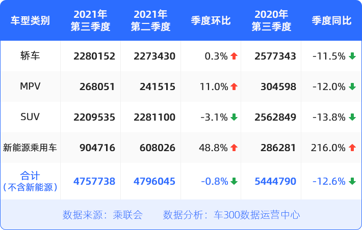 根据乘联会数据显示,2021年第三季度全国狭义乘用车销量475.8万辆,同比下跌12.6%,销量下滑约68.7万辆。 由于海外疫情反复,缺芯局面一直未能得到缓解,多数厂商、渠道库存锐减,车企陷入无车交付的困境,影响了新车销量。反观新能源乘用车,与燃油车形成鲜明对比,第三季度销量突破90万辆,同比大增216%,增长约62万辆;全年销量有望达到300万辆。