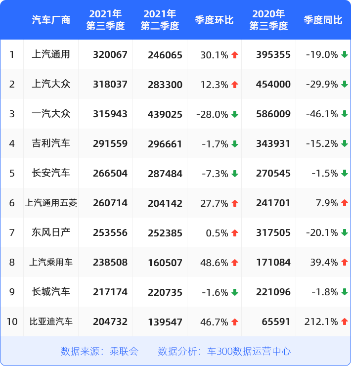 受缺芯、原材料价格上涨等市场因素冲击,多数车企业绩承压,合资车企尤为明显。入围TOP10榜单的合资车企第三季度销量同比下滑均达到两位数,一汽大众接近腰斩。自主车企比亚迪则是另外一番景象,第三季度销量超过20万辆,同比增长212%。