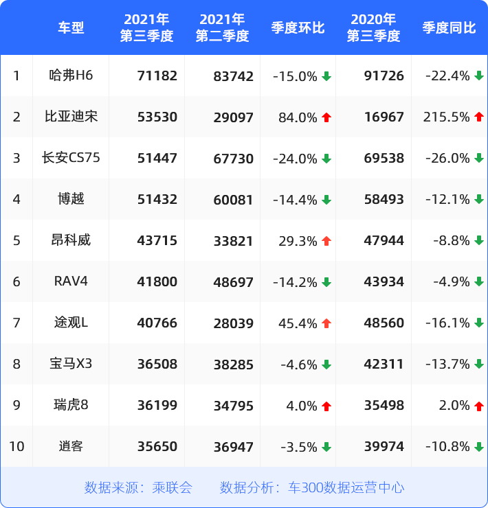 SUV市场表现也不尽乐观,TOP10榜单有8款车型销量同比出现下滑;哈弗H6虽依旧霸占榜首,但也难掩下滑之势,同比下跌超过20%。拥有芯片自产自销能力的比亚迪第三季度杀出重围,旗下比亚迪宋销量突飞猛进,第三季度销出超过5万辆,同比激增215%,力压长安CS75,升至榜单第二。