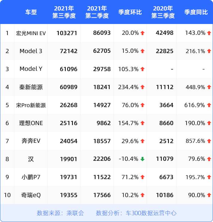新能源市场第三季度再创新高,入围榜单车型销量同比均有大幅增长,大有替代、赶超燃油车市场之势,拉动车市向新能源转型的步伐。TOP10榜单中已分化出明显的头部集团,上汽通用五菱、比亚迪、特斯拉旗下车型销量遥遥领先其他车企车型,逐步形成三足鼎立之势。