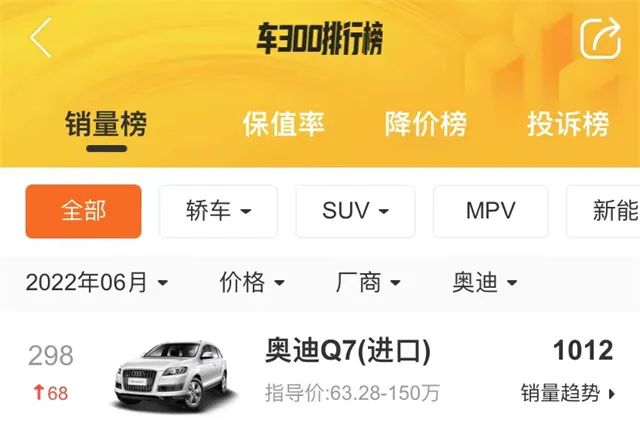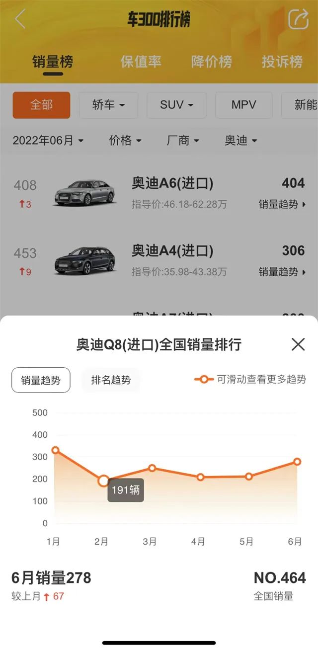 按照车300 二手车 APP 的销量排行榜数据显示,奥迪 Q8 六月份的销量仅为 278 辆,而且二到五月的销量都在一两百台左右。