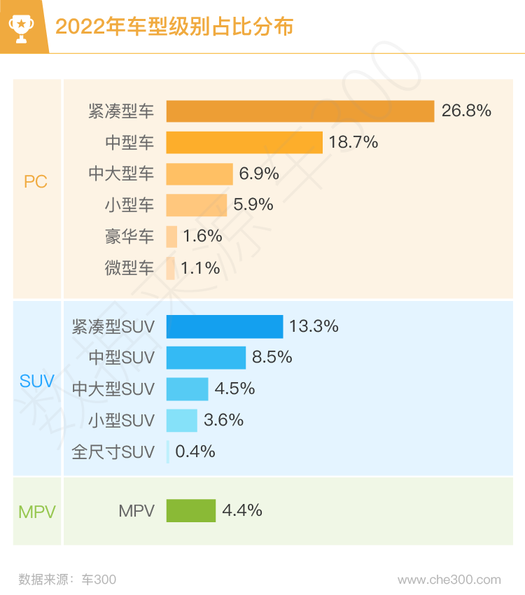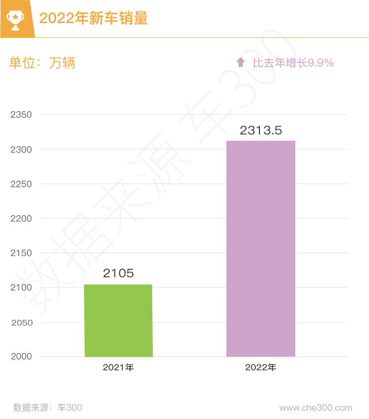 2022年全国狭义二手车乘用车交易量约1292.3万辆,比2021年下跌2%,交易量下滑约27万辆;具体到细分市场,轿车交易约787.8万辆,同比下跌4.2%;SUV交易约392万辆,同比增长3.9%;MPV交易57.2万辆,与去年基本持平。新车方面,全年狭义乘用车售出约2313.5万辆,相较于2021年增长9.9%,多售出209万辆。