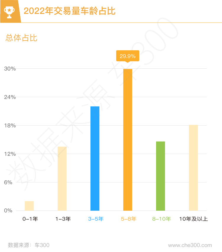 各车龄段二手车交易量分布中, 5-8年车龄段的交易量占比最高,占比接近30%;3-5年车龄交易量占比次之,达22%;10年以上车龄段交易量占比新高,超过18%;