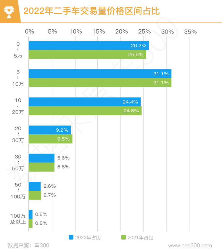 价格区间占比分布中,市场交易最多的车辆价格在5-10万元,占比超过三成;5万以内交易量占比次之,占比超总体四分之一;各价格区间交易车辆占比与去年相比,整体变化较小。