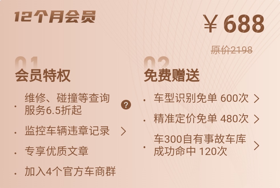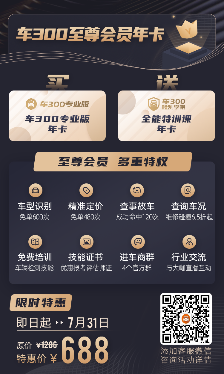 所有购买年会员产品的用户,均可免费参加车300推出的车辆检测技能培训(网课)!也可以优惠办理全国通用、行业认可的二手车鉴定评估师《职业技能证书》,持证上岗,信誉加倍!同时还可参加贯穿全年的直播活动,与行业大咖零距离交流经验,拓展人脉圈!
