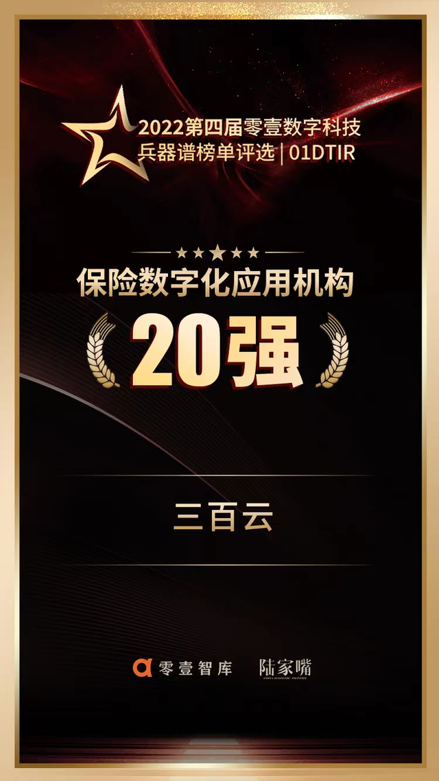 近日,由全联并购公会信用管理专委会、深圳信用促进会、零壹智库、《陆家嘴》杂志、《价值线》杂志联合主办的“第二届中国信用经济发展峰会暨零壹智库年度峰会”在线上举办,“2022第四届零壹数字科技兵器谱榜单”隆重揭晓,南京三百云信息科技有限公司(下称三百云)获评“保险数字化应用机构20强”。